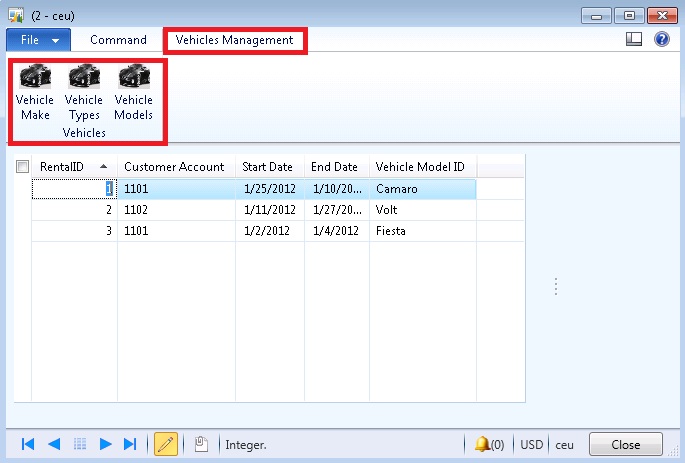 4. Drag the Eduardo_VehicleMakeTable, Eduardo_VehicleTypeTable, Eduardo_VehicleModelsTableMenu Items to the ButtonGroup located in the Form Eduardo_CustCarTable form > Designs>ActionPane>ActionPaneTab:Vehicles> ButtonGroup